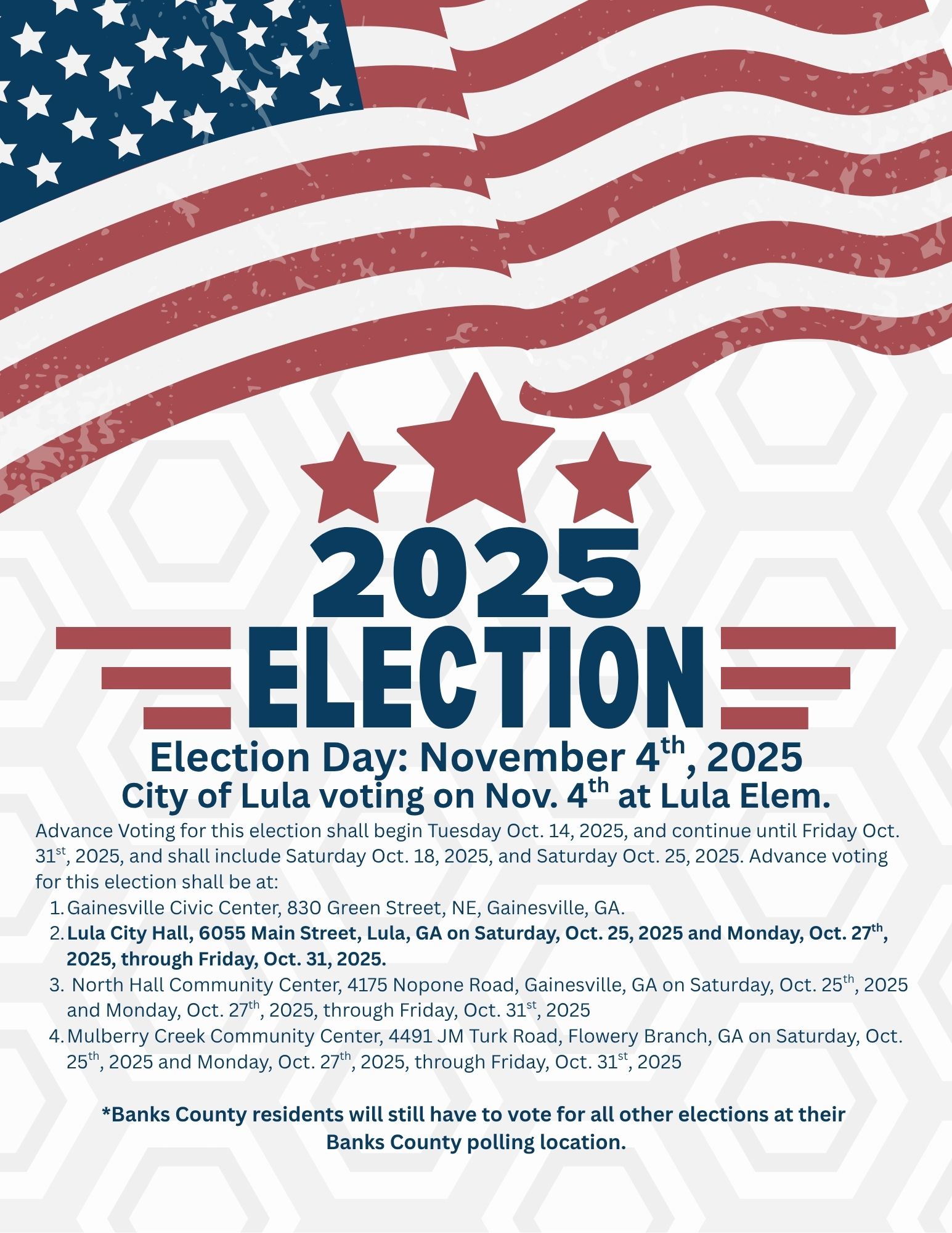 The 2025 City of Lula Elections garnered significant attention within the community. With Mayor Joe Thomas and Councilwoman Denise Shockley stepping down from their positions, there was considerable anticipation regarding who would fill these seats. Amanda Browning and Bruce Lane both entered the mayoral race, while Andrew Carlyle ran unopposed for the District 2 Council seat, succeeding Mrs. Shockley. Notably, the District 3 Council seat attracted considerable interest, as Chris Lewallen, who had won a special election against Felton Wood in May 2024, faced Mr. Wood once more.