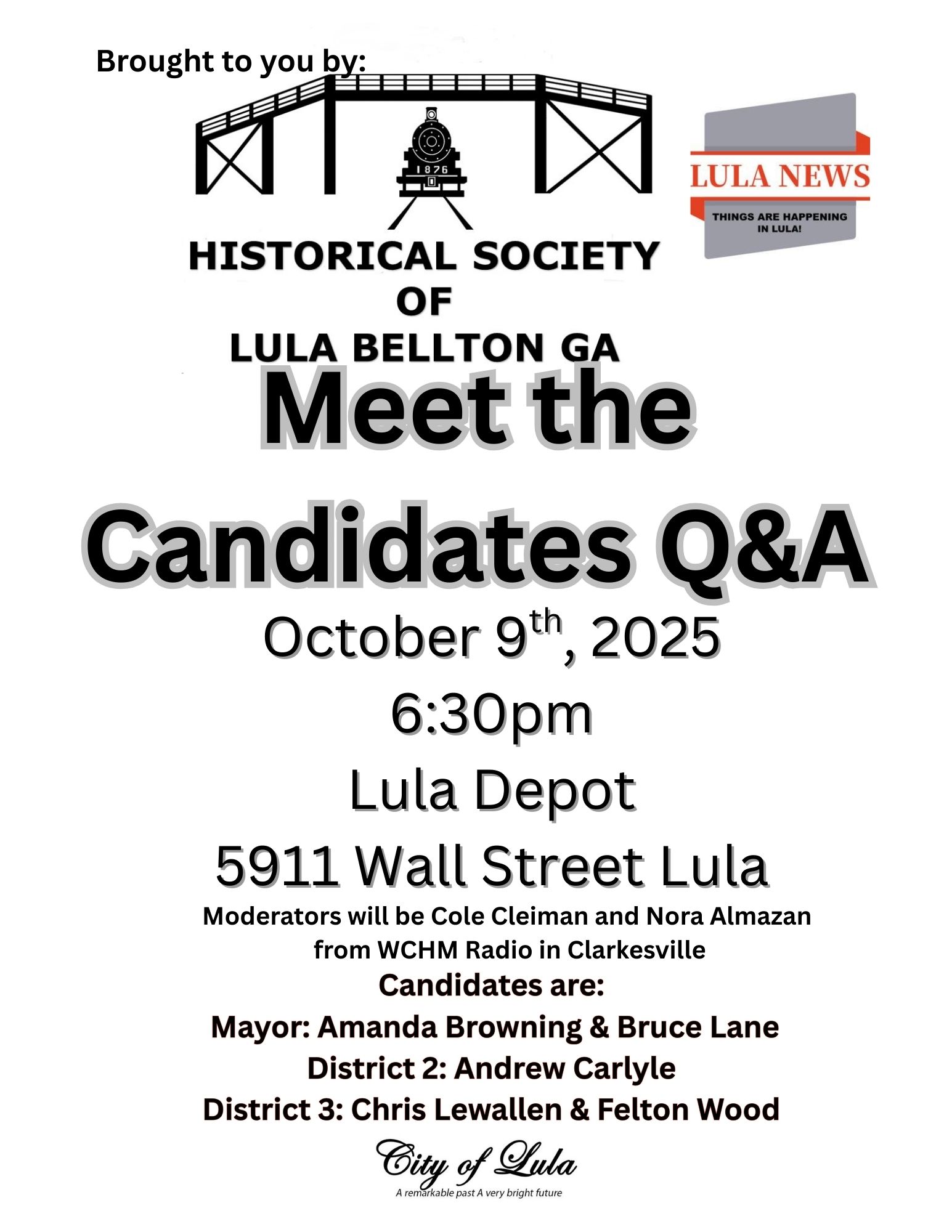 In partnership with Lula News, the Historical Society of Lula Bellton GA held its first Meet the Candidates Q&A event. Moderators Cole Cleiman and Nora Almazan from WCHM Radio posed identical questions to each candidate and managed the proceedings. Board Member Bobby Shockley served as timekeeper, while President Juliette Talley Roberts acted as MC. Jim Grier, a Board Member and Lula News reporter, coordinated the broadcast of the event via Facebook and YouTube for remote viewers.