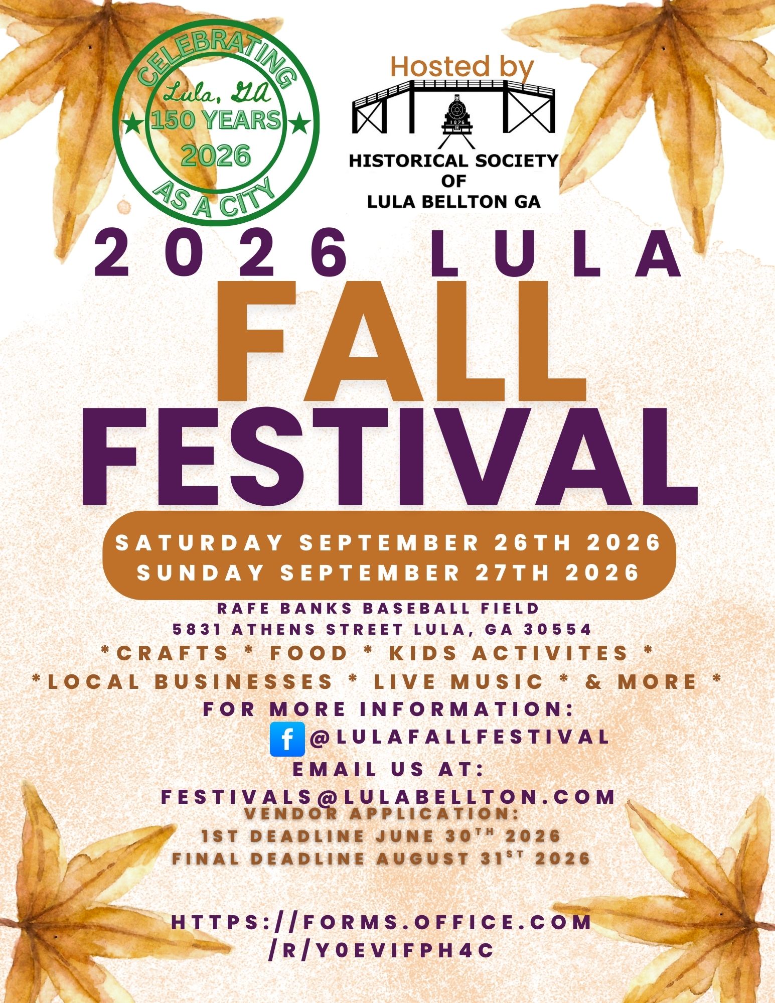 As Lula approaches its Sesquicentennial (150) year in 2026, the City of Lula’s City Council, Historical Society of Lula Bellton, Lula Development Authority, Lula Ladies, and Lula Masons are collaboratively planning several events to commemorate this significant milestone.