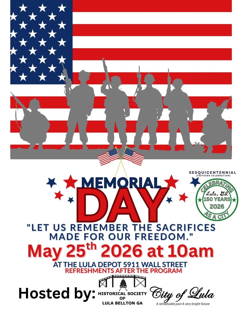The Memorial Day Celebration is scheduled for Monday, May 25th, 2026, at the Lula Depot. The ceremony will commence at 10:00 a.m. This event provides an opportunity for the community to come together in remembrance of those who served and did not return home.