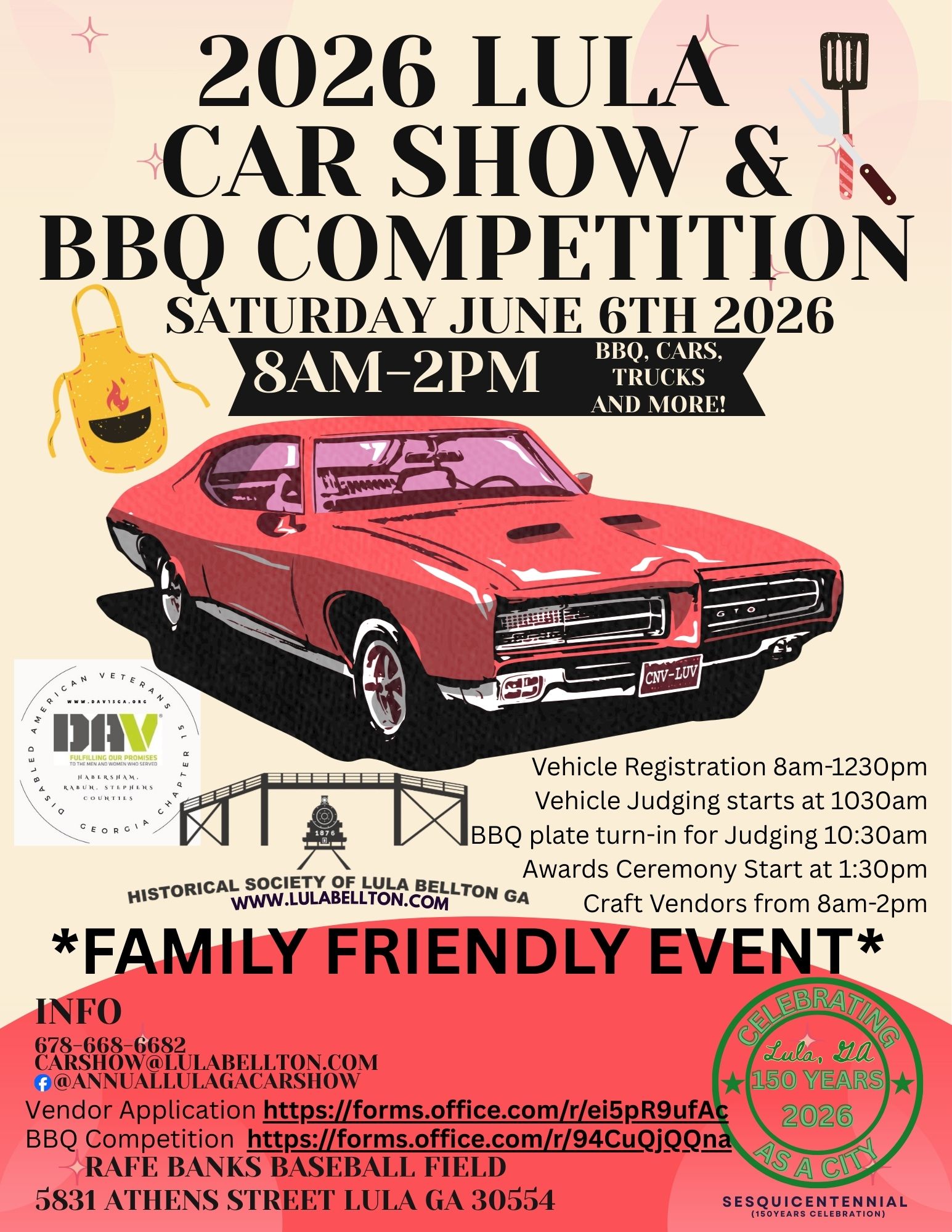 New for the 2026 Lula Car Show is the BBQ Competition, held as part of the Sesquicentennial Celebration marking Lula’s 150th anniversary. As always, we encourage car enthusiasts of all ages to showcase their vehicles for the community. Our judges look forward to welcoming returning participants and new competitors alike.